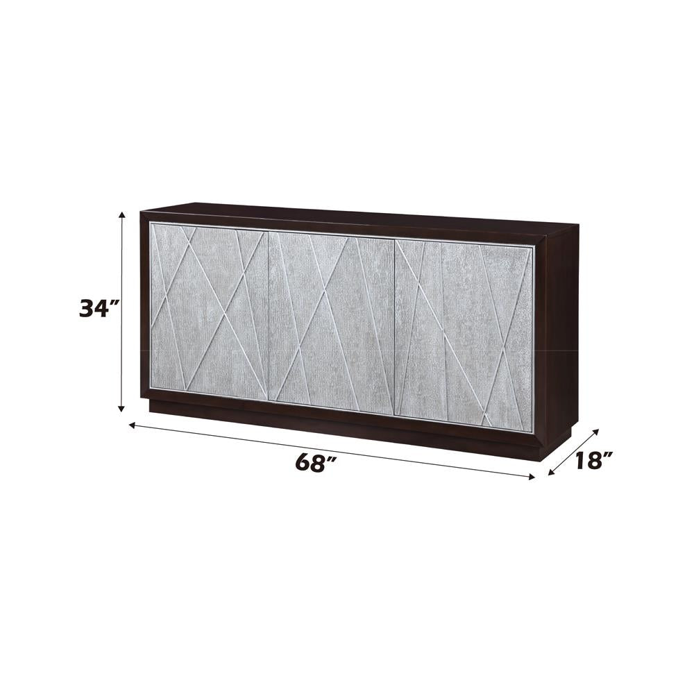 • Geometric Patterned Front: The door panels have a geometric pattern that adds a decorative and contemporary touch to the piece.