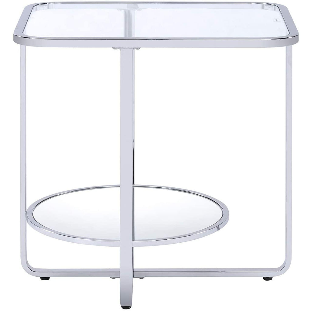 • Features: Glass Top, Mirrored Shelf, Metal Sled Base (Open Base)