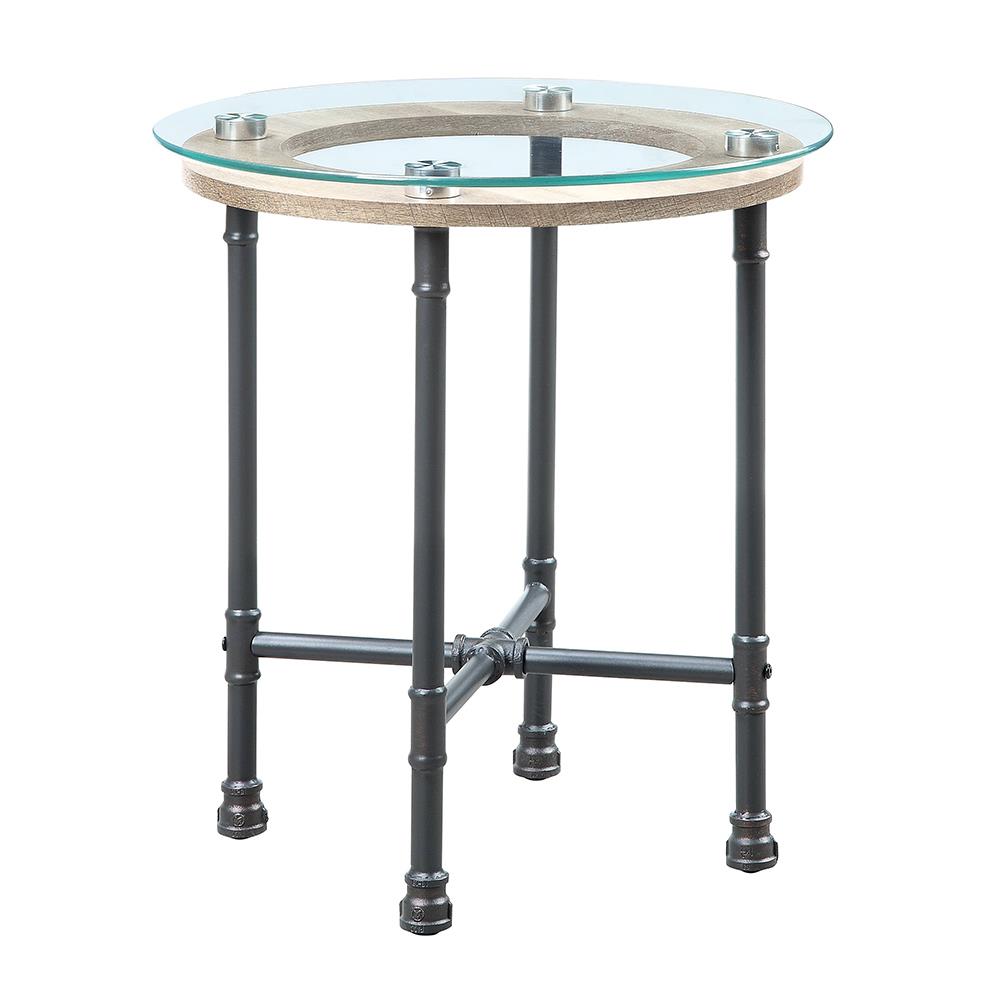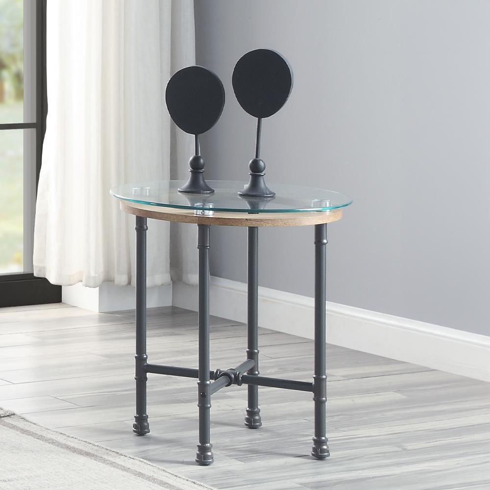 The Brantley End Table by Acme Furniture features metal legs, a glass top, and a two-tone finish.