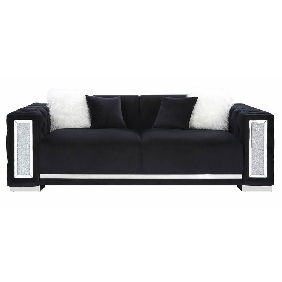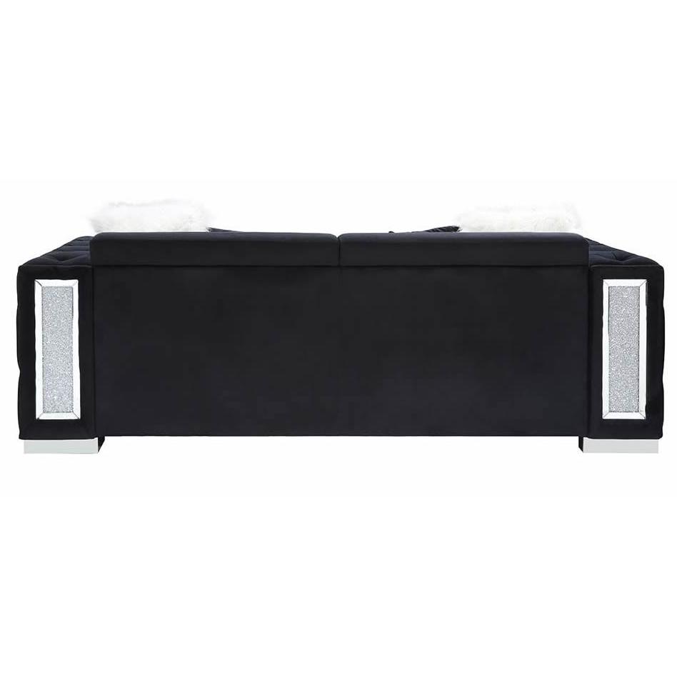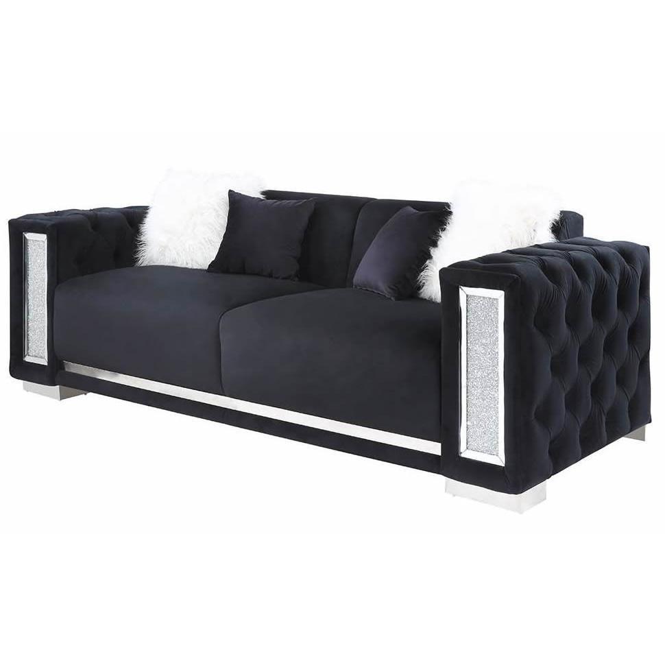 Center your living room around utmost sophistication and exquisite style with this Trislar collection. The collection offers your interior space... Center your living room around utmost sophistication and exquisite style with this Trislar collection. The collection offers your interior space eye-catching appeal with its button-tufting details and mirrored trim accent. In a buttery soft black velvet upholstery to add richness and perfect modern glam addition for any room. With sleek chrome legs, this piece not only adds refined elegance, but also provides ultimate tranquility. View more