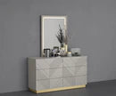 It's built from solid wood and upholstered in PU material with gold accent; Wings can be added on both sides...  It's built from solid wood and upholstered in PU material with gold accent; Wings can be added on both sides ; LED light running through the footboard and rails. Four-drawer spacious chest with built-in mirror and jewelry storage. The two drawers nightstand comes with wireless charging feature 6 Drawer Double dresser with LED mirror All the case goods have soft close feature. Box spring is not required as the bed comes with the bed board View more