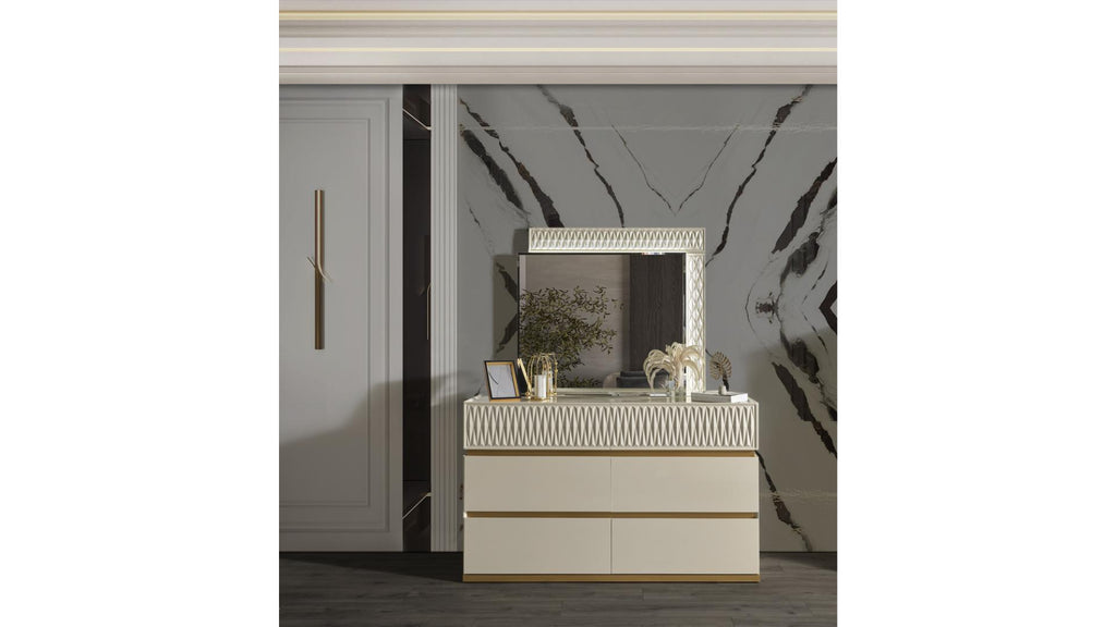 Upgrade your bedroom with this luxurious 5-piece modern bedroom set, designed for both style and functionality. Featuring a sleek gold... Upgrade your bedroom with this luxurious 5-piece modern bedroom set, designed for both style and functionality. Featuring a sleek gold and cream lacquer finish, this set adds a touch of elegance to any space. The upholstered headboard with LED lighting creates a soft, ambient glow, perfect for relaxation. The geometric design on the case goods adds a unique, contemporary touch, while the soft-close drawers ensure seamless and quiet operation. Crafted from solid and manufactured wood, this set provides durability and a refined aesthetic. Whether you 1.Material: solid and manufactured wood2.Gold and cream lacquer finish.3.LED Features4.Upholstered Headboard: Plush fabric with a geometric pattern adds a touch of elegance. View more