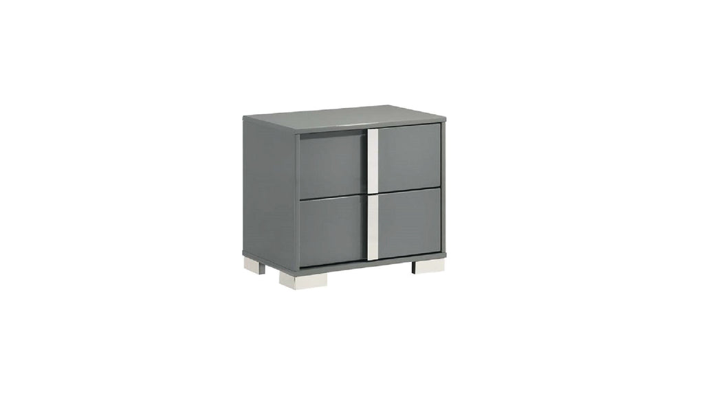 Enhance your bedroom with this sleek and functional 5-piece modern bedroom set. Designed for contemporary living, this set features a... Enhance your bedroom with this sleek and functional 5-piece modern bedroom set. Designed for contemporary living, this set features a high-gloss lacquer finish in an elegant gray tone, offering a sophisticated touch. The headboard includes built-in LED lighting and storage shelves, providing both ambiance and convenience. The textured panel detailing adds depth and character to the design, while soft-close drawers ensure smooth and quiet operation. Crafted from solid and manufactured wood, this set is built for durability and modern appeal. 1.Material: Crafted from solid and manufactured wood for long-lasting durability. 2.Finish: High-gloss lacquer finish in a stylish gray tone for a modern look.  3.LED Features: Integrated LED lighting in the headboard enhances ambiance.  4. Built-In Storage: The headboard features open shelves for easy access to essentials. 5.Modern Design: Clean lines with a textured panel effect for added sophistication. View more
