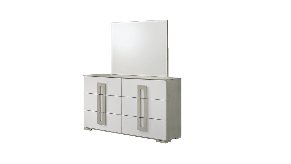 Enhance your bedroom with this contemporary bedroom set, featuring a sleek high-gloss white lacquer finish and a padded LED-lit headboard.... Enhance your bedroom with this contemporary bedroom set, featuring a sleek high-gloss white lacquer finish and a padded LED-lit headboard. Designed with clean lines and a minimalist aesthetic, this set adds a refined and modern touch to any space. The five-piece set includes a bed, dresser, mirror, chest, and nightstand, all crafted with soft-close drawers and elegant metal handles for both style and functionality. Built with durable materials, this set offers a long-lasting and sophisticated upgrade to your bedroom. High-gloss white lacquer finish for a sleek, modern appealLED-lit upholstered headboard for ambient lightingSoft-close drawers for smooth and quiet operationFive-piece set includes bed, dresser, mirror, chest, and nightstandDurable construction ensures long-lasting useElegant metal handles for a refined, contemporary touch View more