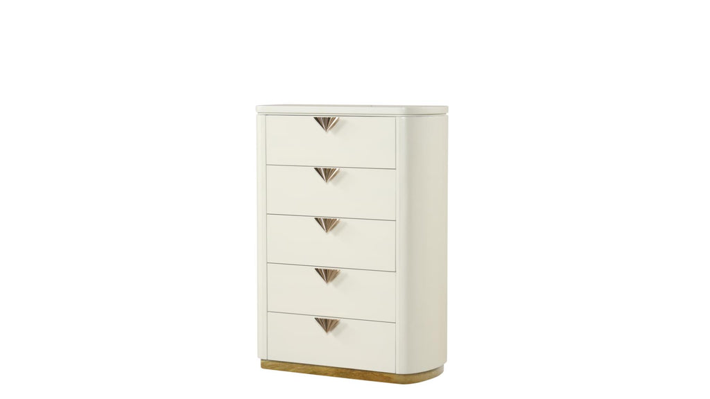 This contemporary bedroom set blends luxurious design with modern functionality, featuring an elegant cream lacquer finish accented with gold details.... This contemporary bedroom set blends luxurious design with modern functionality, featuring an elegant cream lacquer finish accented with gold details. The bed showcases a plush, upholstered headboard with integrated LED lighting and decorative side panels, adding sophistication to any space. The footboard offers built-in storage, while the case goods, including the dresser, chest, and nightstand, provide ample space to keep your bedroom organized. A statement mirror with matching LED accents completes the set, making it a perfect addition to any upscale bedroom. High-quality lacquer finish in cream with gold accentsHeadboard: Upholstered with LED lighting and decorative side panelsStorage: Built-in storage drawers in the footboard for added functionalityCase Goods: Dresser, chest, and nightstand with spacious soft-closing drawers View more