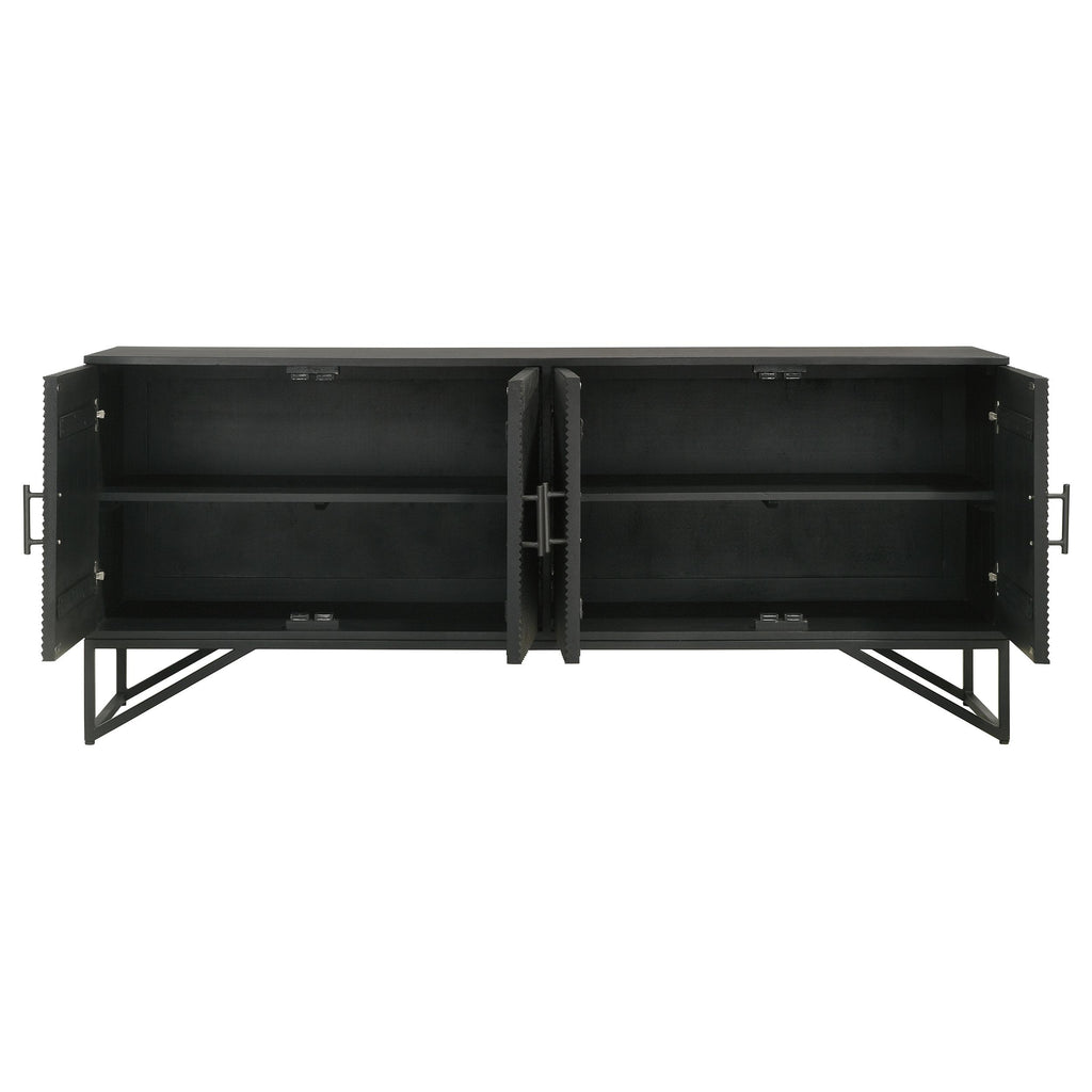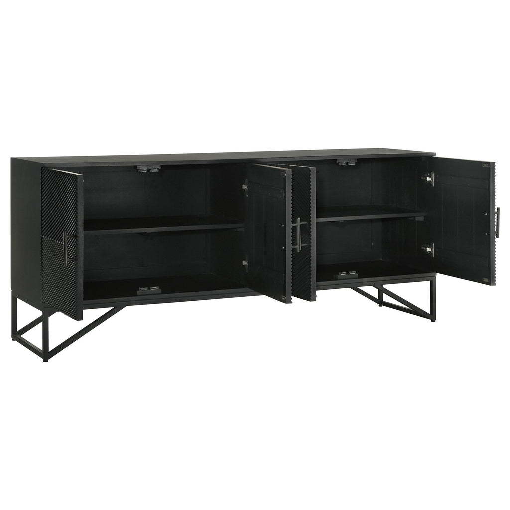 • Bold finish composite wood and iron merge to create a stylish and durable four-door accent cabinet perfect for use in your dining room, living room, or media room