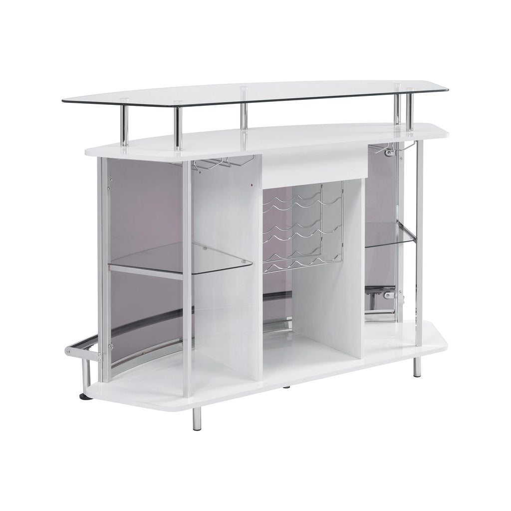 • Contemporary crescent shaped front bar unit in white high gloss lacquer finish