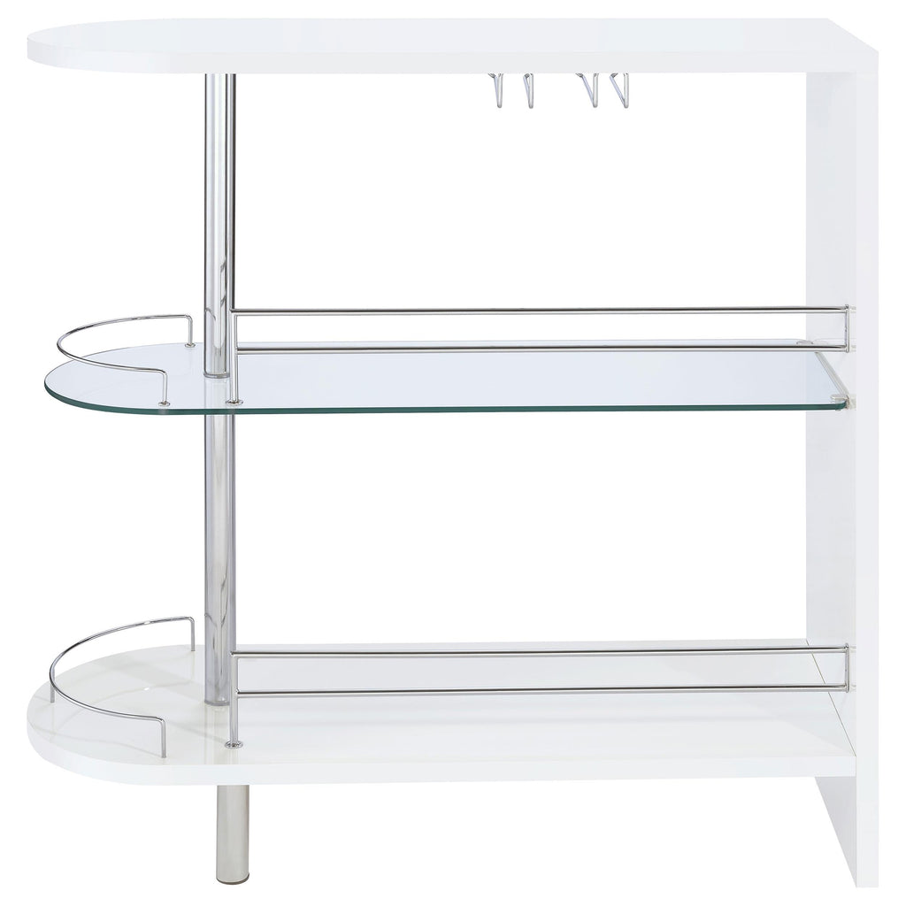 • Storage features include two (2) tiers of shelving, including one (1) glass shelf with guardrails, and stemware racks