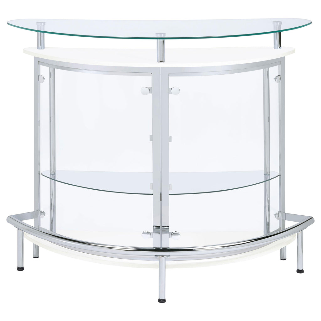• Contemporary white bar unit with a curved metal frame in a trendy chrome finish