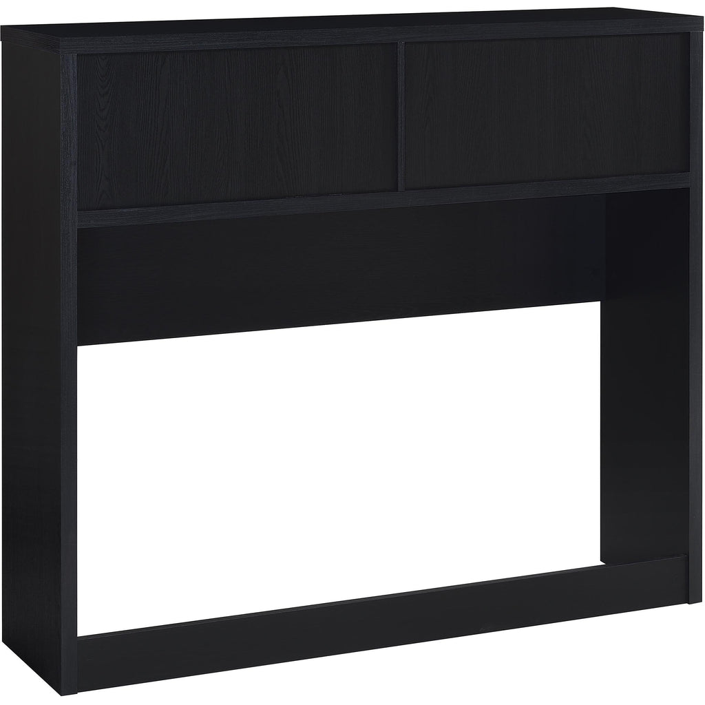 • Full bookcase headboard with a black oak-inspired finish