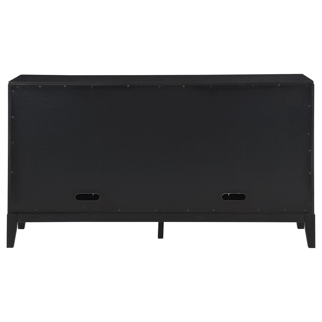 • Black finish wood construction with wire brush distressing is bold, versatile, and textural