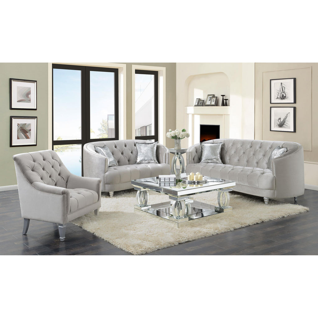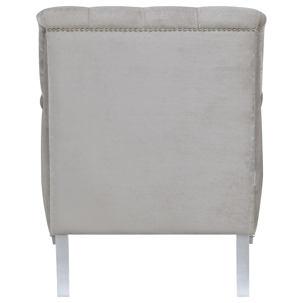 • Soft, grey velvet upholstery with deep rhinestone tufting