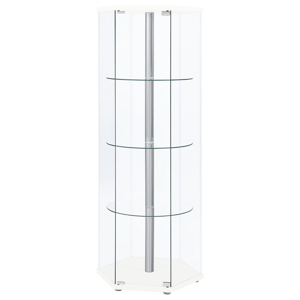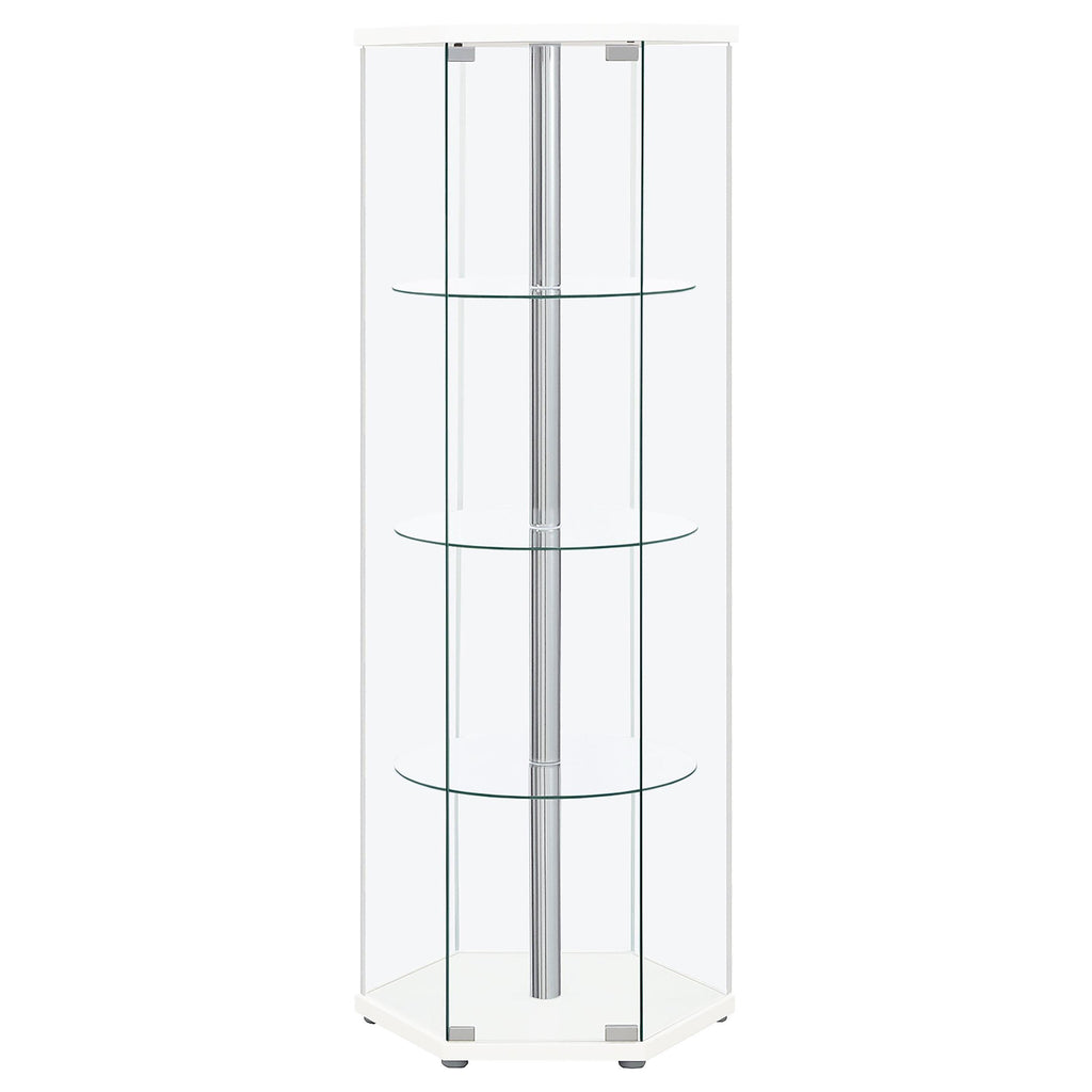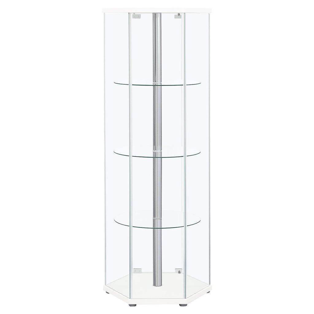 • Three round clear tempered glass shelves provide strength to support your display items