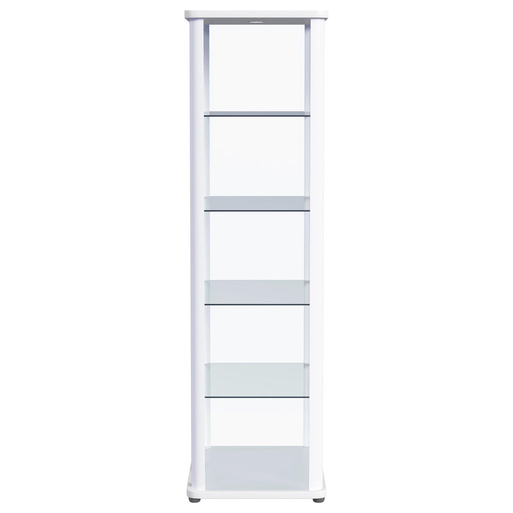 • Showcase all your favorite treasures with a modern four-shelf curio cabinet with lighting