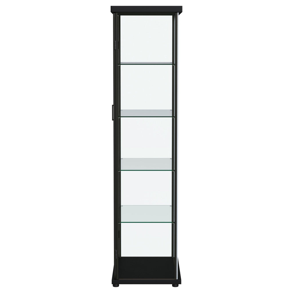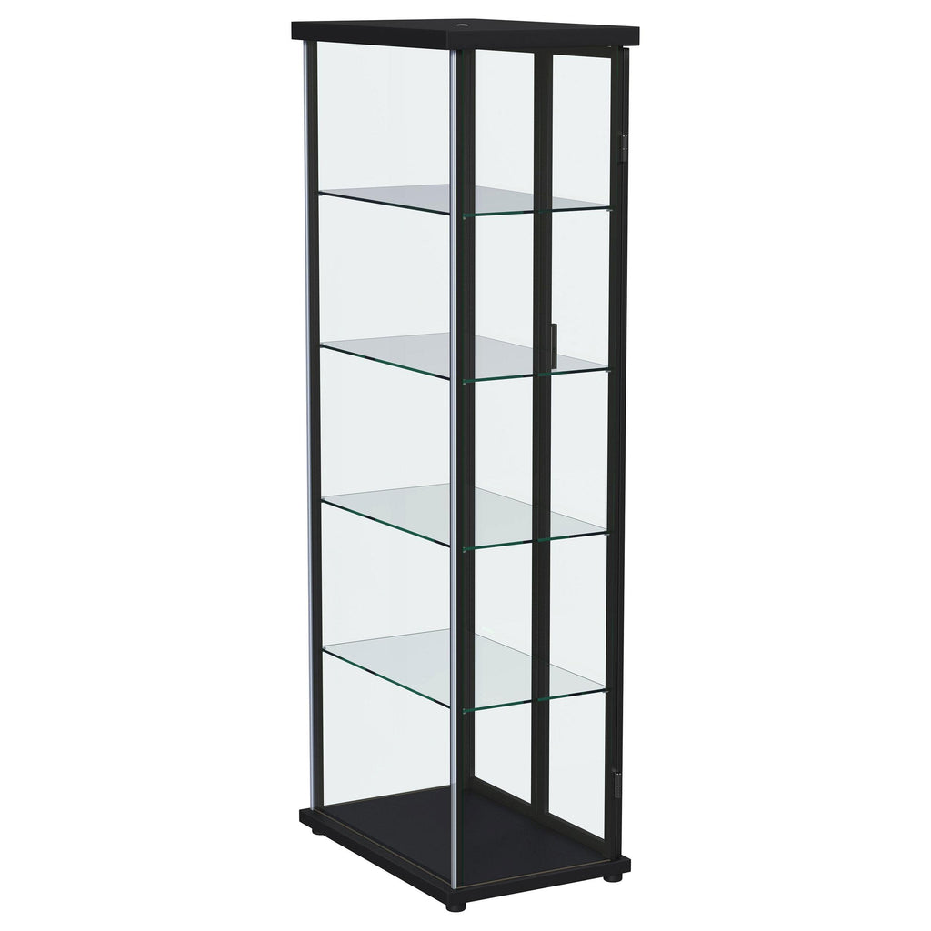 • Showcase all your favorite treasures with a modern four-shelf curio cabinet with lighting