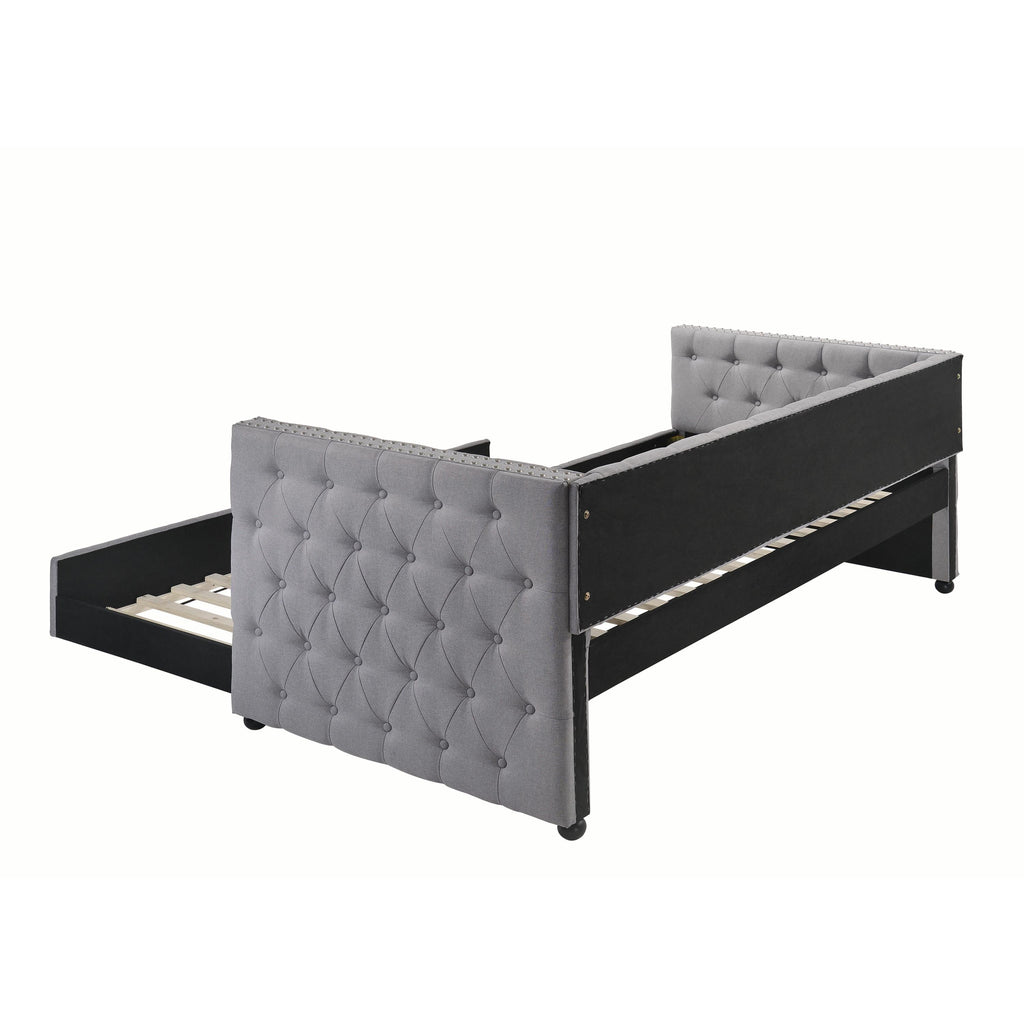 • Twin upholstered daybed with trundle in grey fabric