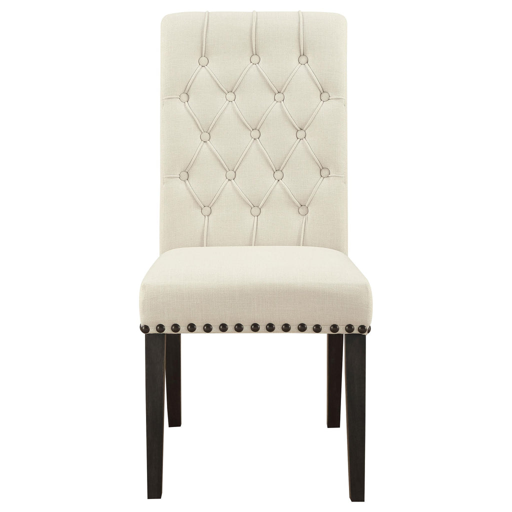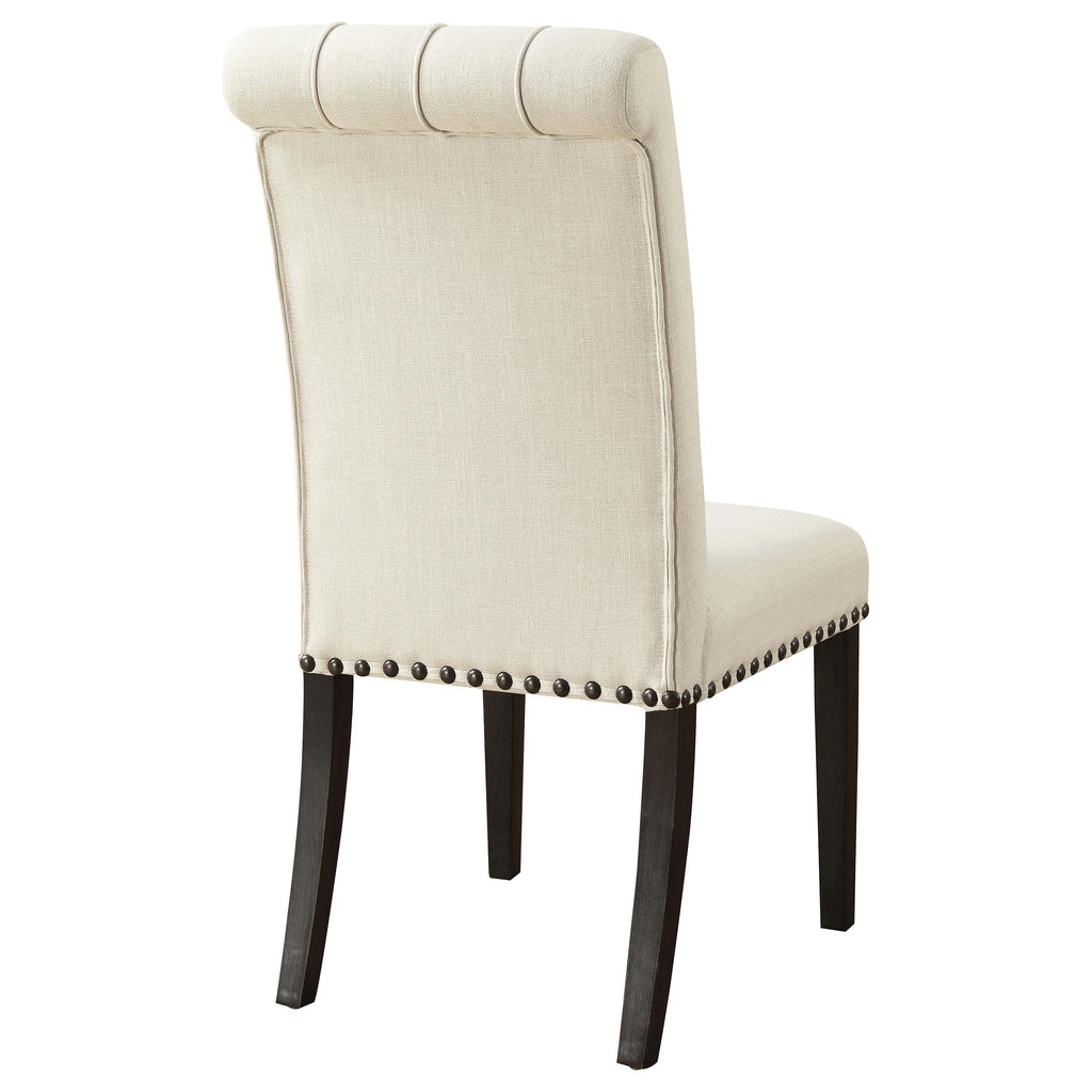 • For a lighter look, plushily padded cream side chairs are adorned with rolled backs and button-tufted upholstery with bold nailhead trim (arm chair #121715 not available)