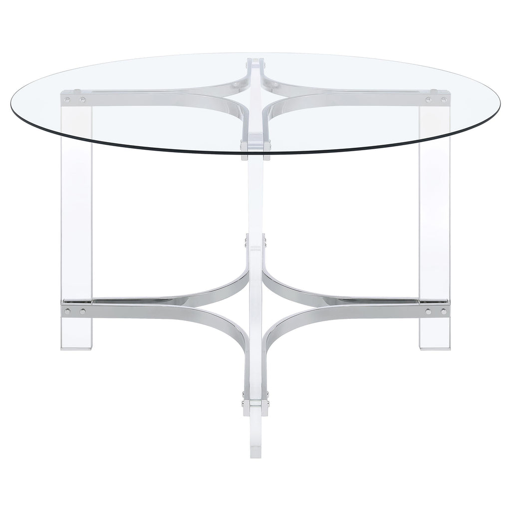 • Round tabletop features clear glass that allows artistic structural design to take center stage