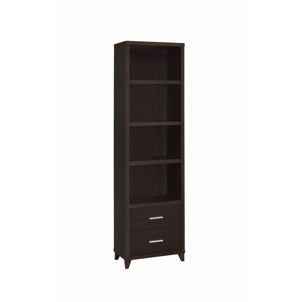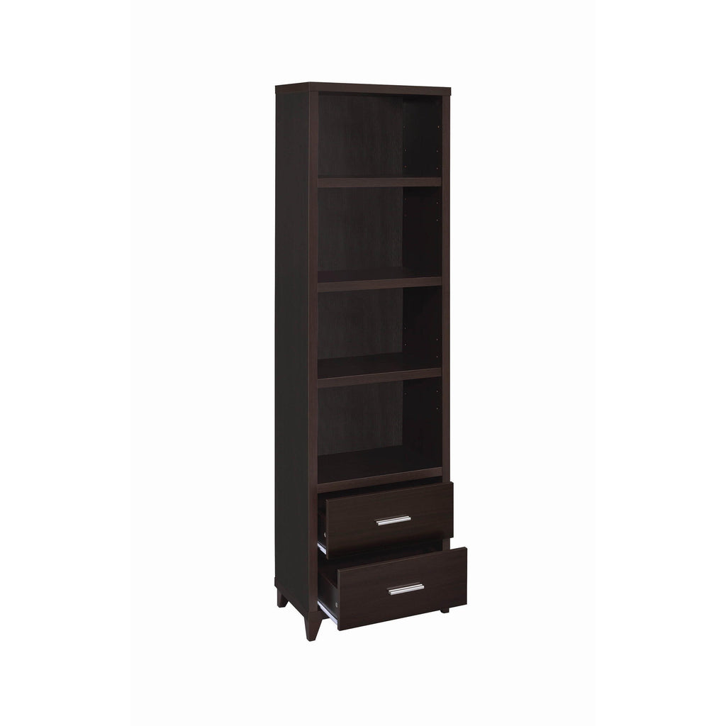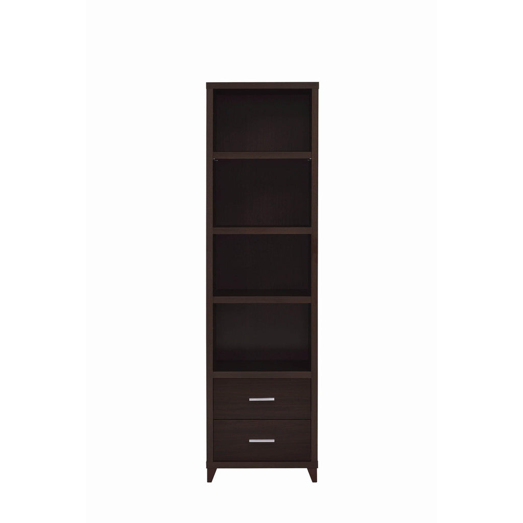 • Media tower features four (4) tiers of storage shelves and two (2) storage drawers