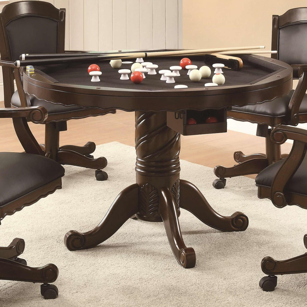 • Three-in-one table with tobacco finish allows easy conversion from dining to gaming