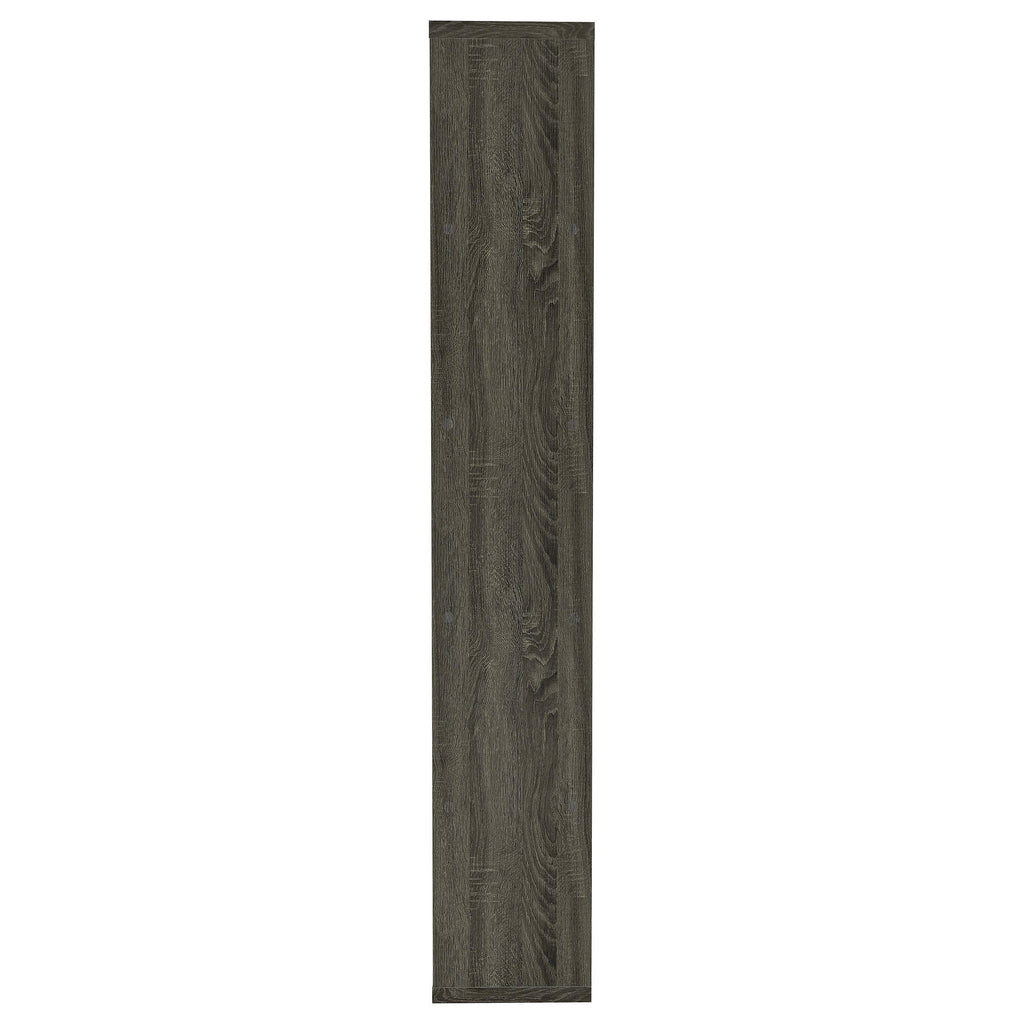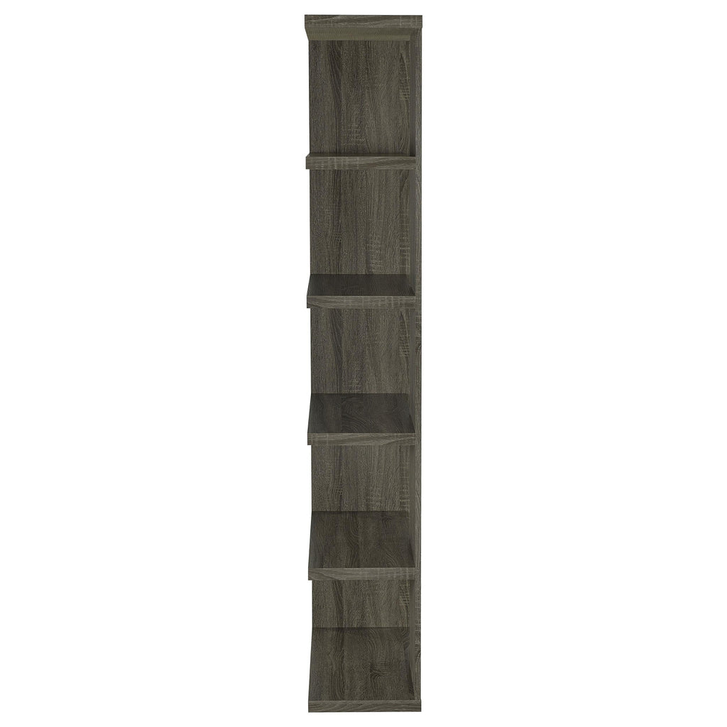 • Modern bookcase in weathered grey finish features interesting design with shelves open on one end