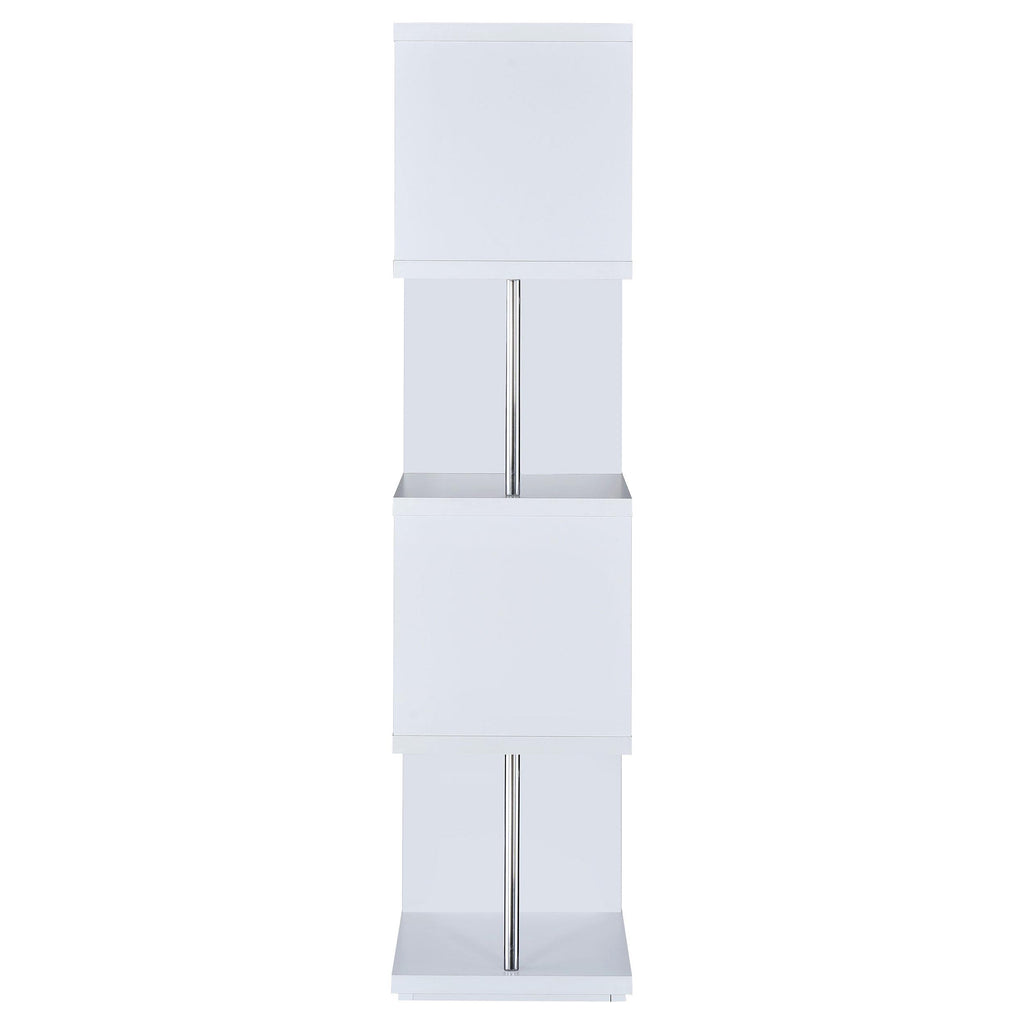 • Modern bookcase with four (4) tiers of shelving and electroplated chrome metal details