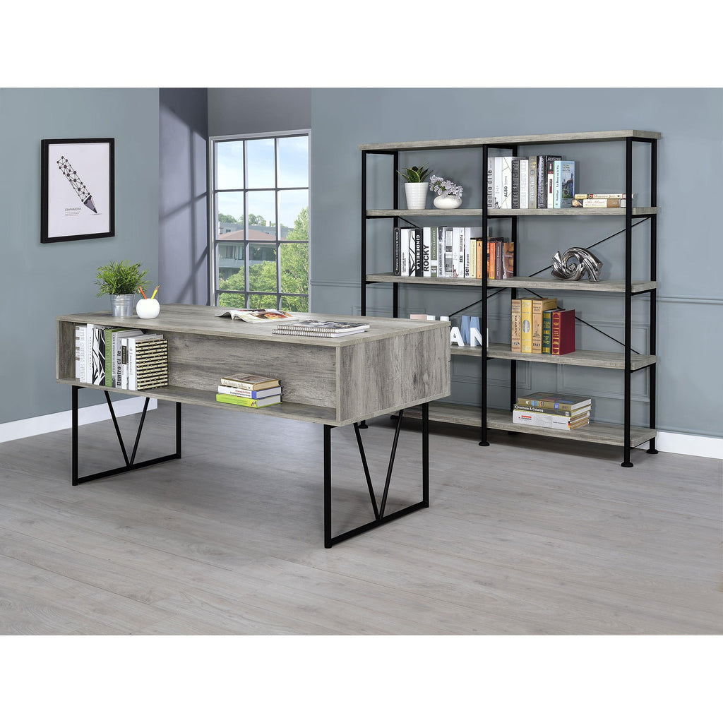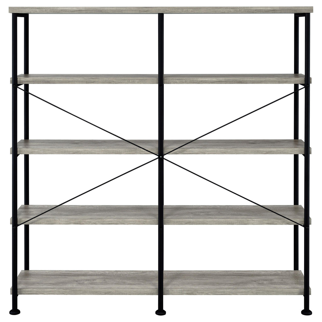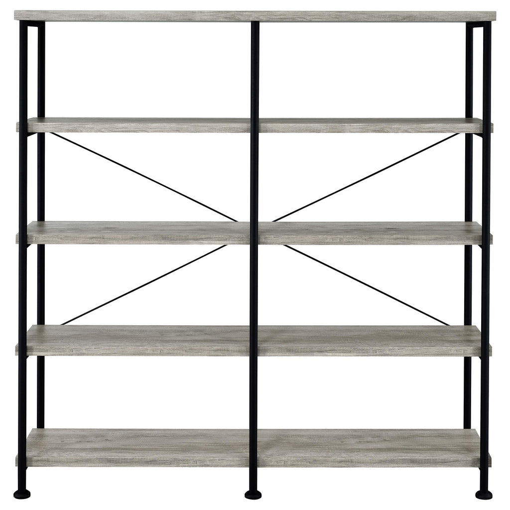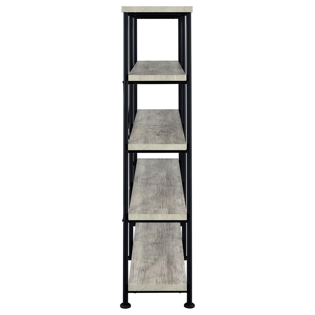 • Rustic industrial bookcase in grey driftwood with black metal frame boasts clean lines for your modern decor