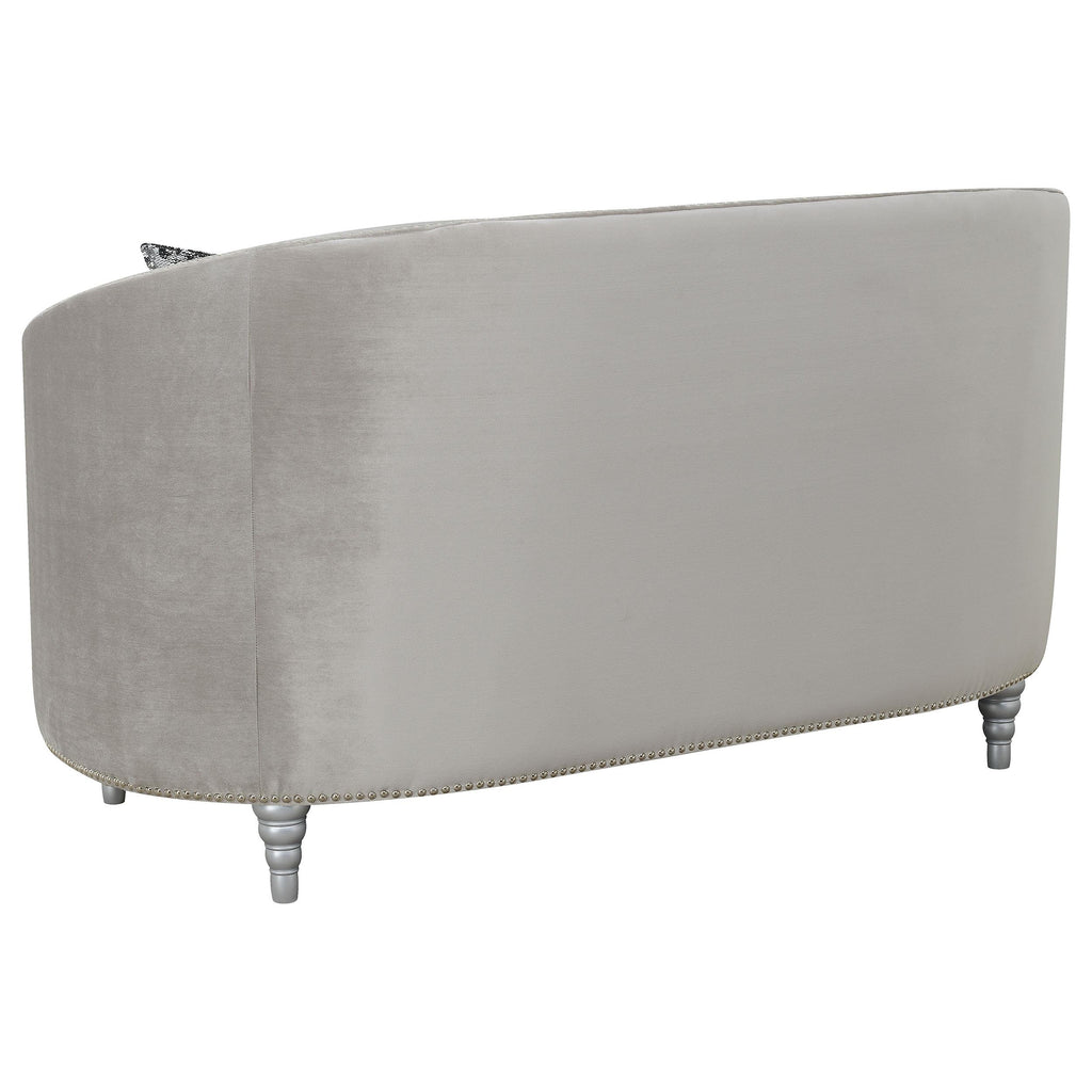 • Soft, grey velvet upholstery with deep rhinestone tufting