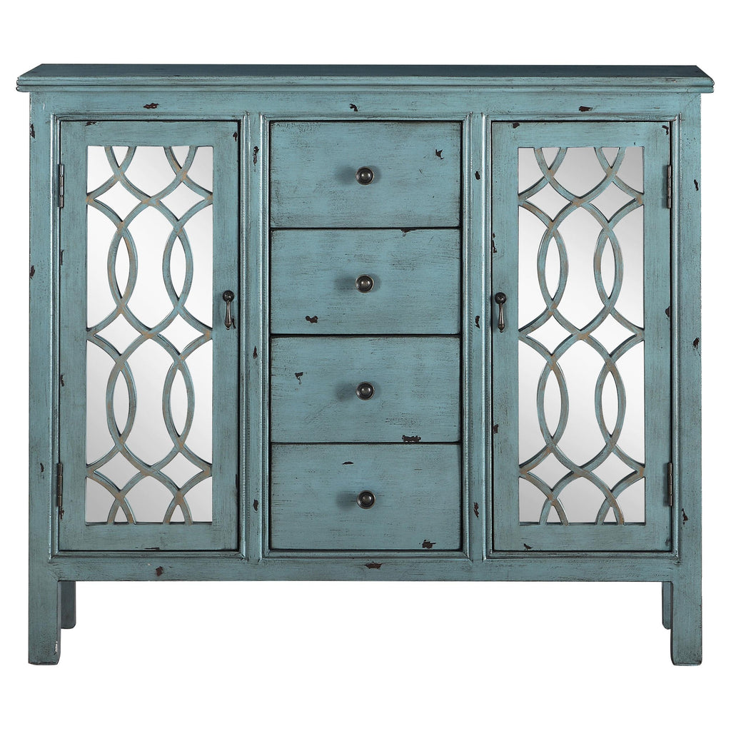 • Accent cabinet in antique blue finish add rustic charm to any space