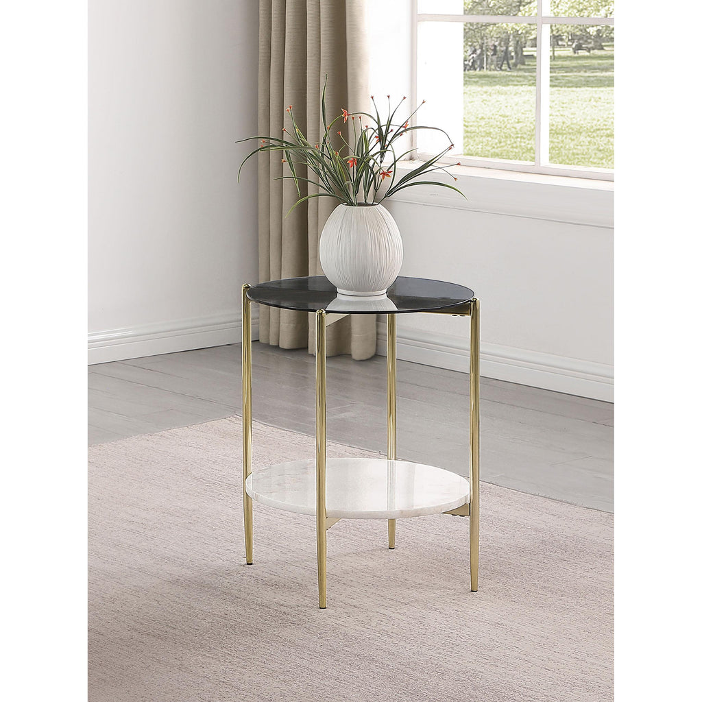 • Modern end table with a smoked tempered glass top and white marble shelf