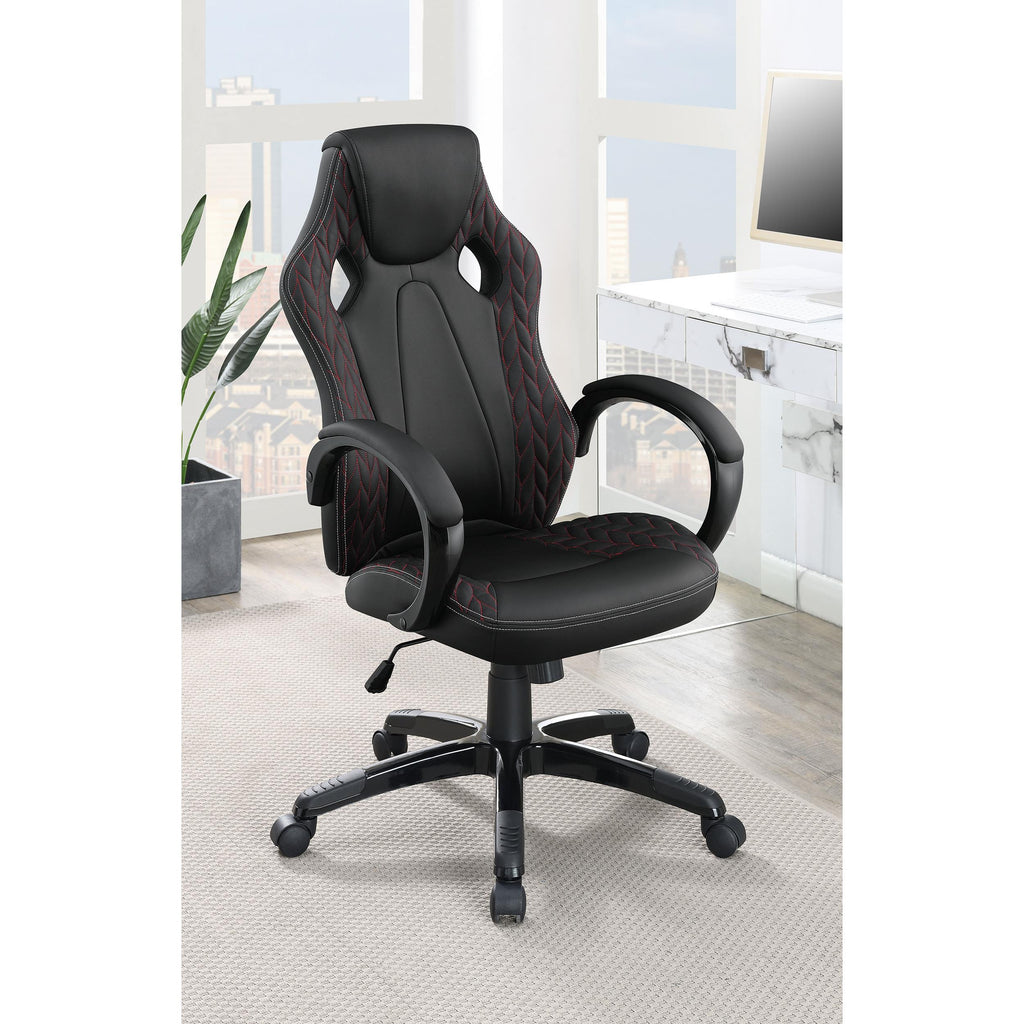• Contemporary office chair wrapped in black leatherette with botanical-inspired herringbone pattern and red stitching details for a bold statement piece