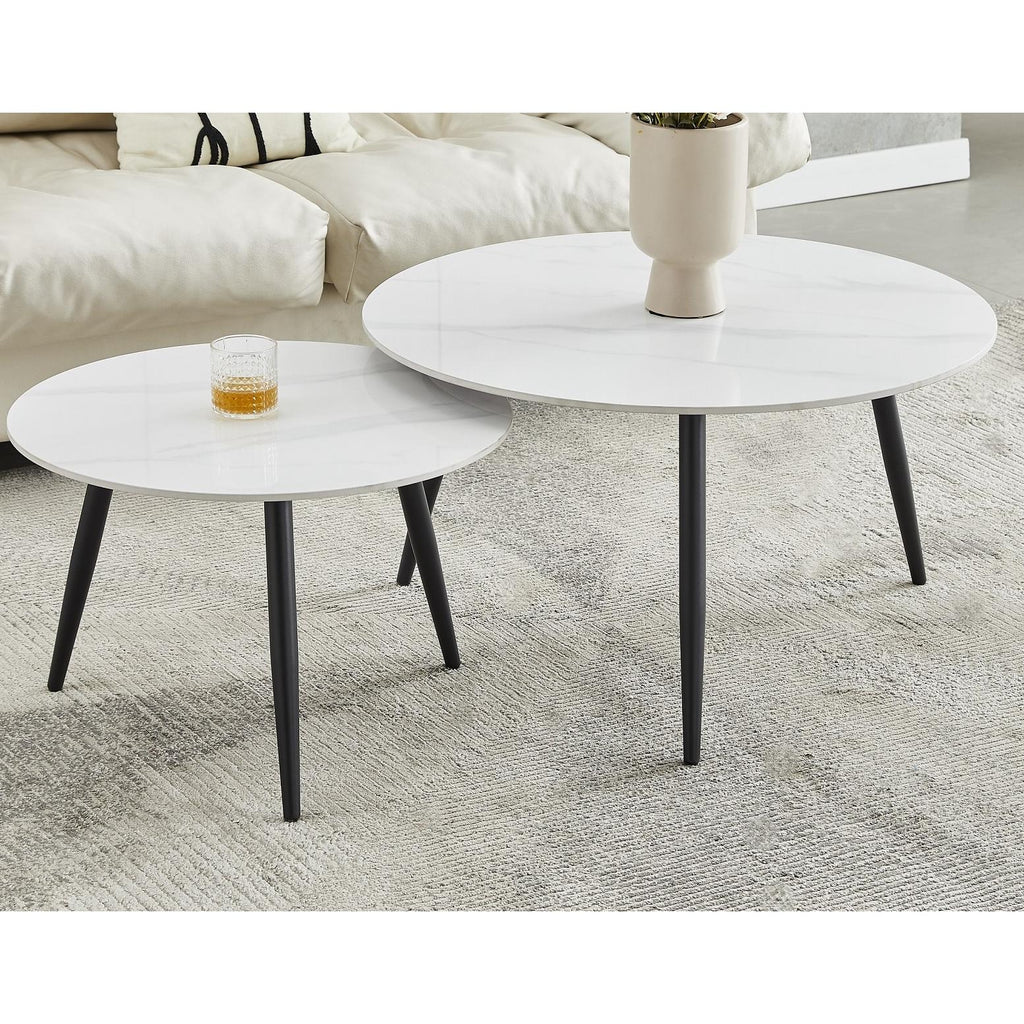 This 2-piece coffee table set features a sintered stone white marble top and black steel legs.