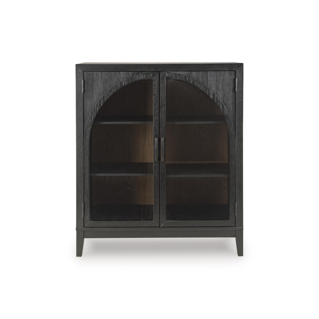 If your love of entertaining is only surpassed by your love of sleek, versatile style, this bar cabinet expertly suits... If your love of entertaining is only surpassed by your love of sleek, versatile style, this bar cabinet expertly suits your needs. Racks for wine bottles and glasses neatly store necessities for a pour of vino. Adjustable shelves comfortably hold additional bottles, dishware or drink-making accessories. For added flexibility, the cabinet's black and natural brown finishes effortlessly pair with your home’s existing aesthetic. Doors with softly curved glass inserts allow this chic piece to double as a display space. View more