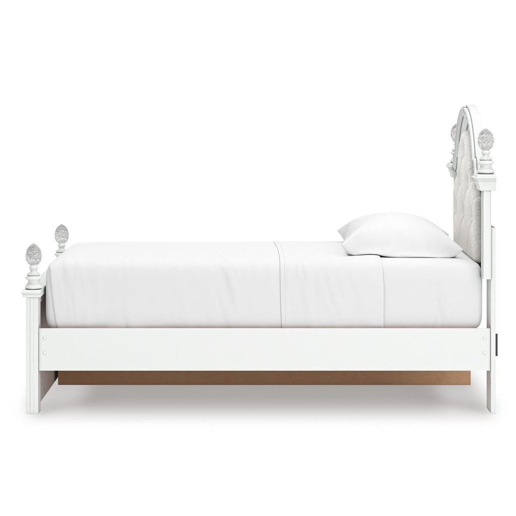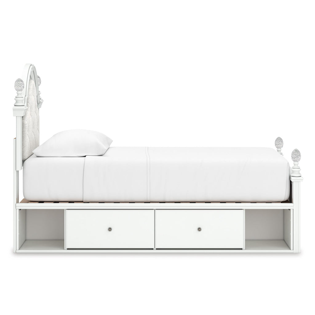 Fit for a princess. This twin upholstered panel storage bed’s crisp matte white finish pairs with charming ornate beading and... Fit for a princess. This twin upholstered panel storage bed’s crisp matte white finish pairs with charming ornate beading and sumptuous button-tufted upholstery—perfect for your girly girl. Spacious storage drawers neatly tuck away bedroom essentials. Decorative ball tops and multicolored LED lighting in the headboard are the crowning touches to make your little one feel like royalty. View more