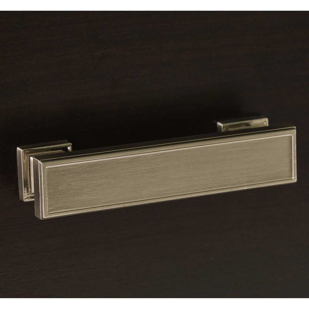 • Metal bar pulls with bright nickel-tone finish