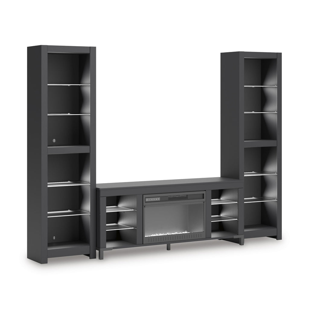 • Fireplace insert and backlit shelves features color and brightness controlled LED lighting