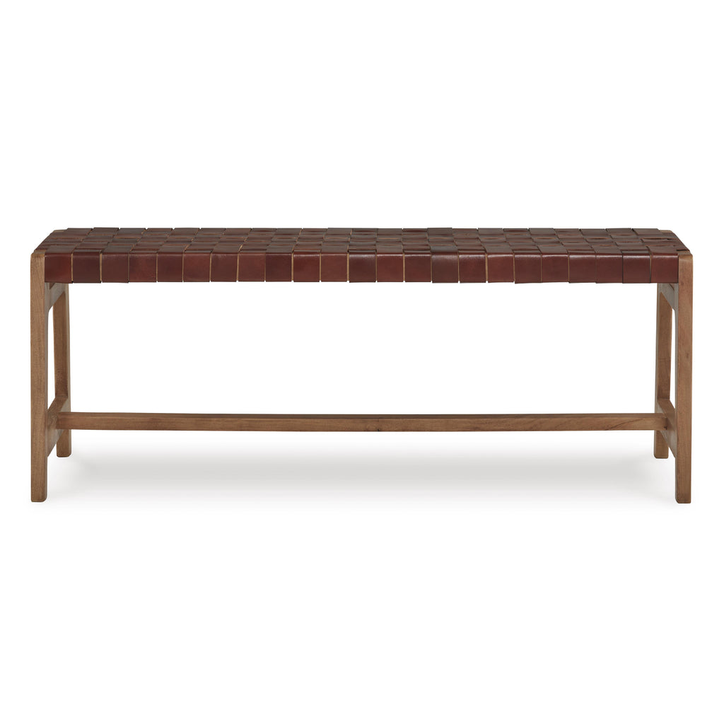 • Upholstered in brown leather woven strips