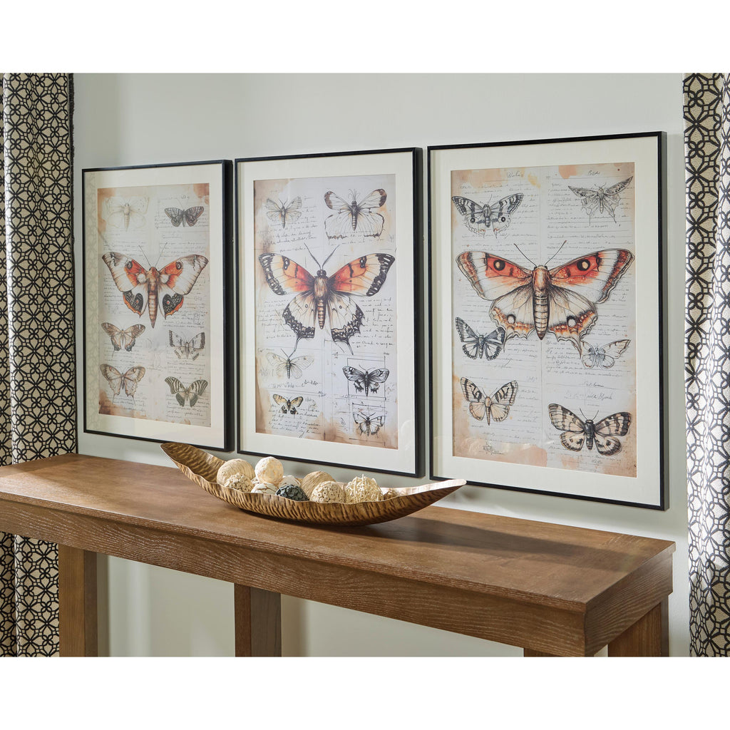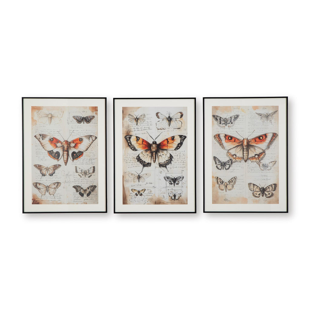 Grace your walls with vintage charm. This exquisite wall art set features intricate butterfly prints floating over a backdrop of... Grace your walls with vintage charm. This exquisite wall art set features intricate butterfly prints floating over a backdrop of antique script, creating a timeless and elegant look. Sleek black frames add subtle sophistication to this trio. View more