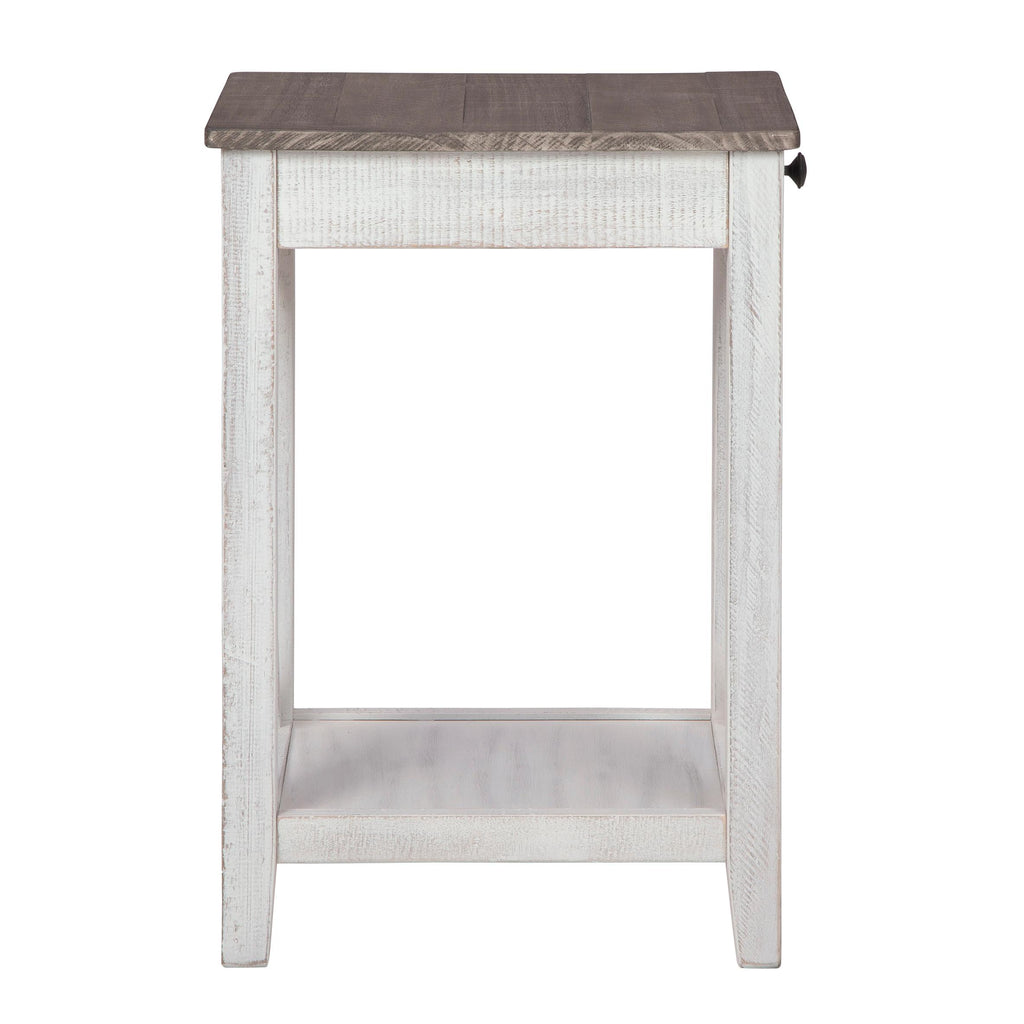 • Made of veneer, solid and engineered wood in distressed white and gray finish
