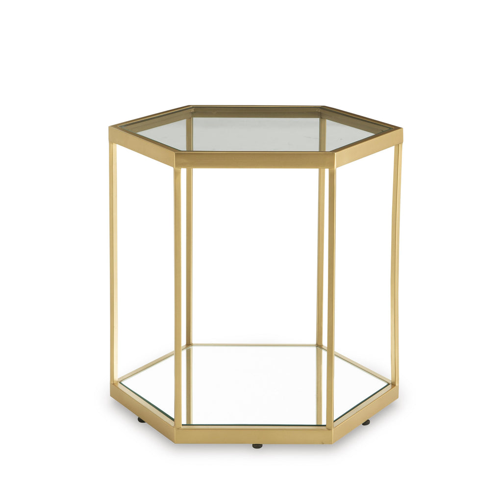 With a sleek goldtone frame accenting glass and mirror insets, this striking accent table combines the very best of modern... With a sleek goldtone frame accenting glass and mirror insets, this striking accent table combines the very best of modern design. Whether you use it to display decor or hold your favorite drink, the hexagonal design makes it a true standout piece in your cosmopolitan-chic space. View more