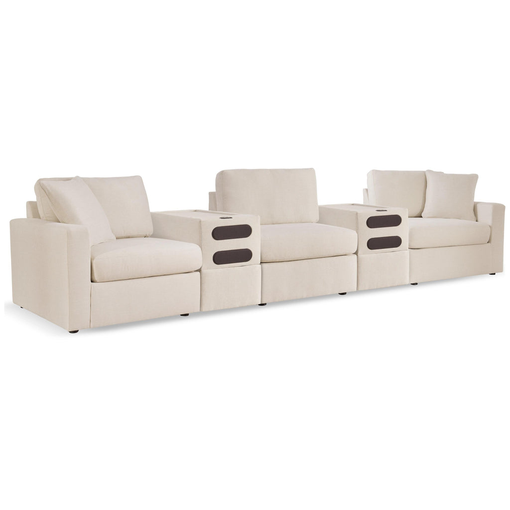 • Includes 5 modular pieces: left-arm facing corner chair, armless chair, 2 audio consoles with storage and right-arm facing corner chair